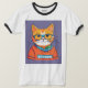 A camiseta apresenta um gráfico ousado de gato artístico que pode ser uma silhueta elegante ou uma ilustração estilizada. As opções incluem um desenho de linha minimalista de um gato numa pose contemplativa ou um padrão geométrico mais detalhado que aponta para a forma de um gato.