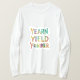 Um gráfico ousado com "Yearn, Yield, Yonder" em uma incompatibilidade dinâmica e multicolorida de fontes. Um design de camiseta lúgubre com as palavras "Yearn, Yield, Yonder" em uma mistura de cores e fontes diferentes.