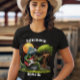 Sob um pôr do sol laranja, uma iguana animada apodrece em um violão elétrico vermelho ao lado de uma árvore florescente, com notas musicais no ar expressando o ritmo e a melodia. rock and roll iguana.