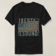 O texto em negrito "Resons de Eco da Liberdade" é dividido na frente da camiseta em um espectro vibrante de cores. Este design de olhar faz uma declaração poderosa.