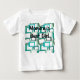 Esta camiseta bebê tem uma design moderna do século médio de retângulos mastigados com buracos brancos em tons de azul-esverdeado. Mude o ditado, ponha o nome do seu bebê, ou tire o escrevendo completamente.