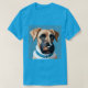 Retrato ilustrado de um cão terrível com olhos expressivos, vestindo um colar azul contra um fundo vibrante. O estilo da arte moderna combina realismo e criatividade, destacando as características e charme únicos do animal.