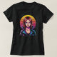 The composition focuses on the woman's face and upper torso, with lighting that highlights her features and the contrast between her figure and the background. The image has a strong influence of synthwave or vaporwave culture, combining retro elements with futuristic touches and a vibrant color palette.