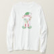 Esta camisa de manga longa e divertida mostra o ditado "mama elf" com cores alternadas em letras minúsculas com acentos brilhantes. O topo das palavras tem um chapéu de elfo e o fundo tem pernas de elfo. As cores incluem rosa, vermelho, verde e azul claro.
