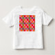 This toddler t-shirt has a mid-century modern design of red, pink, and orange squares and green and blue lines forming a plaid design.