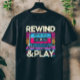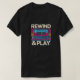 Aqui está outro design de camiseta do estilo "vintage" com uma música retrô e a frase "rewind and play". Avise-me se você quiser mudanças! 🌄 ✨