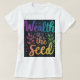 A camiseta apresenta um design arrojado e atraente com o texto "Riqueza é a Semente" exibido de forma destacada na frente. O texto é um vibrante gradiente multicolorido, com cada palavra um tom diferente para representar as diversas formas que a riqueza pode crescer e florescer. O design geral é simples mas impactante, deixando muito espaço para a mensagem brilhar.