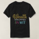 A t-shirt apresenta a frase "Riqueza Envolvida em Wit" num gradiente multicolorido vibrante. Cada palavra transita suavemente para a próxima, criando um design dinâmico e atraente.