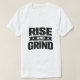 Monochrome typographic design featuring the phrase “Rise and Grind” arranged in a stacked layout. The artwork uses bold lettering with subtle grain texture, a central banner element, and star icons on a dark background, creating a clean, strong, text-focused composition suitable for apparel and accessories.