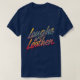 A design da camiseta apresenta a frase "Rindo em Couro." em letras ousadas e multicoloridas que caem como tinta em um fundo preto. As letras estão estilizadas no estilo de arte do grafite, dando ao design uma vibração rebelde e ousada. O efeito global é visualmente impressionante e atraente para os olhos.