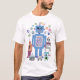 Os robôs cômicos e os homens mecânicos de todos os tamanhos e formas estão rodeados por engrenagens flutuantes em um design retrô perfeito para fã de vintage sci-fi, quadrinhos e brinquedos antigos. Um robô azul gigante lidera o grupo enquanto rodeado por seus minons. Artes flutuantes em laranja, verde, azul e magenta adicionam detalhes divertidos ao design.