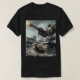 Um robô com o corpo de um tanque rastreado e a metade superior de um corpo humanoide segurando um lançador de rochas sobre o ombro direito, está viajando a velocidade através de uma cidade arruinada e está mostrando sinais de danos em batalha. Por martinspixs.