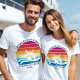 Celebrar as férias de cruzeiro da sua família com t-shirts coincidentes, com uma roda estilizada de navio com onda oceânica num fundo retrô de sol.