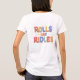 Esta camiseta vibrante apresenta a frase "Rolls and Riddles" em um design lúdico multicolorido. A palavra "Rolls" é renderizada em uma fonte arredondada e em negrito com um gradiente de tons quentes, em transição de vermelho para amarelo