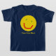Um sol amarelo de olhos verdes sorrindo sobre um fundo azul. Adicione seu próprio texto.
