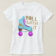 Design de diversão para amantes de anos 80 ou patinadores de rolos com uma ilustração retrorativa de um skate de rolo em azul com um parafuso de brilho dourado preto projetado sobre ele. O texto da tipografia diz "ROLL WITH IT" em fontes escritas à mão divertida. Citação inspiradora e engraçada.