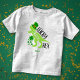 Adicione um toque especial à sua Rua. Dia de Patrick com esta t-shirt de dinossauros personalizada. A camisa tem o texto Lucky Saurus Rex, um dinossauro verde, quatro trevas de folhas, e um lugar para adicionar um nome (o nome pode ser removido, de acordo com sua preferência).