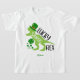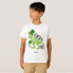 Adicione um toque especial à sua Rua. Dia de Patrick com esta t-shirt de dinossauros personalizada. A camisa tem o texto Lucky Saurus Rex, um dinossauro verde, quatro trevas de folhas, e um lugar para adicionar um nome (o nome pode ser removido, de acordo com sua preferência).