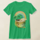 Uma t-shirt com uma ilustração adorável, com um sorridente pote verde e dourado com um arco-íris fofo, uma nuvem feliz e um trevo verde.