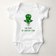 Um cogumelo fofo com manchas de shamrock. Abaixo está a mensagem "Minha Primeira Rua. Dia de Patrick" em texto verde.