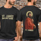 O texto "Rua. James tem as minhas costas" está na frente. As costas têm uma imagem católica tradicional de Ruas. James, o Apóstolo.