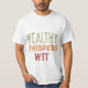 A t-shirt apresenta a frase "Wealthy Whispers Wit" num gradiente multicolorido vibrante. Cada palavra é uma forma diferente, criando um design dinâmico e atraente com uma estética limpa e moderna.