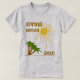 Camisa de destino com palmeiras e o sol brilhando intensamente no céu. As palavras nascem num cartaz aflorado à mão e no ano em curso. Você precisa mudar para o ano atual.