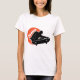 A t-shirt branca mostra um salto de skate preto no pôr do sol.