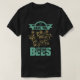 Esta camiseta preta apresenta um design ao estilo vintage com uma faixa teal que lê "SAVE O" acima ilustrações de abelhas e flores. A palavra "BEES" é exibida de forma destacada em uma fonte especial angustiada abaixo dos gráficos florais e de insetos. A design geral promove a conservação das abelhas com uma estética russa e country.
