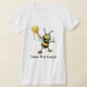 Uma abelha de mel feliz com a sua colher de mel a descer de uma vara de mel. Seus braços se levantaram no ar e um grande sorriso em seu rosto, entusiasmado por ter tanto mel. O texto diz para salvar as abelhas por baixo da imagem.