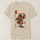 Um gato feroz em uma gi de karatê vermelha, fazendo uma pose de artes marciais contra um pano de fundo de pergaminho com a caligrafia japonesa.