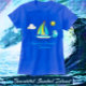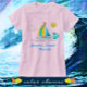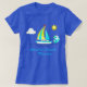 Diversão e colorida da Ilha Sanibel, ondas oceânicas da Flórida e t-shirt de veleiro. O barco é azul-turquesa brilhante, branco e amarelo. Há uma nuvem inchada, sol amarelo brilhante, e ondas azuis e brancas. Sanibel Island, Flórida está em um guião azul correspondente abaixo das ondas rolantes do oceano.
