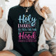 Aceite sua fé e ferozidade com essa camiseta ousada e espirituosa. "Sagrado o suficiente para rezar por você, capuz o suficiente para balançar em você" fala para a mulher multifacetada que equilibra espiritualidade com um toque de asas. Perfeito para a igreja, o brunch ou o veste do dia a dia, esta camisa certamente vira cabeças e provoca conversas. Mostre ao mundo sua força, fé, e senso de humor com esta árvore única.