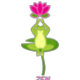 Meditação de sapo de ioga, sentada equilibrada em uma almofada de lírio. Sapo bonito com uma flor de lótus acima.