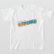 Um design retrô apresenta as palavras "Saudações do Offline" com uma cena de praia e oceano incorporada às letras.