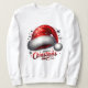 A vivid red Santa hat with plush white trim and twinkling snowflakes; bold festive typography adds warmth, ideal for holiday apparel, gifts, and seasonal home goods.
