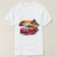 Uma representação pitoresca de um carro vermelho contra um espantoso nascer do sol, colinas, e um coqueiro, incorporando aventura e serenidade. Design de camiseta.