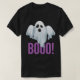 The image features a stylized ghost with a floating white sheet and black eyes and mouth, giving a spooky appearance. Below the ghost, the word "BOOO!" is written in bold purple uppercase letters with a black shadow, emphasizing the scary effect. This image is interesting and relevant for Halloween themes, costume parties, or any context involving scares and fun.