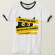 Um gato preto com olhos amarelos está espiando por trás de uma placa amarela que diz "Não seja tímido, tenha orgulho de si mesmo, acredite que você é bom." A expressão do gato é maliciosa e brincalhona, como se encorajasse o usador da camiseta a ser mais confiante.