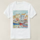 The image shows a watercolor painting of a row of colorful houses by the water with boats moored. The painting is in a charming and simple illustration style.