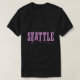 Design de linha do horizonte de Seattle estilizado com marcos icônicos como a Agulha Espacial, Mercado Pike Place e Monte Rainier. Uma homenagem à bela cidade de Seattle, Washington.