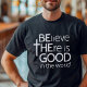 Acredite que há bem no mundo seja o bom e simples texto branco e a placa gráfica original de camiseta cristã impressa em cruz, em www.mylittleeden.com