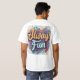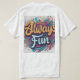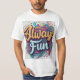 Diversão GeométricaUma camiseta ousada e na moda com a frase "sempre divertido" em cores contrastantes contra um fundo de padrão geométrico.