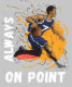 No basquete, a guarda de ponto desempenha um papel muito importante. Deve ter confiança e liderança. A guarda sabe a força e as fraquezas de seus colegas de equipe. Design gráfico de um jogador de basquete que é a guarda principal. Tipografia branca "SEMPRE EM PONTO".