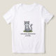Uma t-shirt com uma ilustração cartoon de um gato sentado na grama. Será adequado para serviços de animais de estimação, como sentar-se em gatos, comer, comportamentos em animais, embarcar em animais de estimação, etc. Você também pode usá-lo como presente para um amante de gatos!