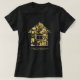 Ouro moderno e negócio negro para camisetas concebidas para serviços comerciais ou residenciais de limpeza, empregadas domésticas, serviços domésticos ou faxineiros. Design com ícone de casa de ouro e ícones de limpeza dentro. Personalize a frente com duas linhas de texto personalizado em um plano de fundo preto.