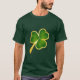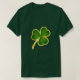 Camiseta masculina verde floresta com uma imagem de um shamrock com corte dourado. A imagem atrás do modelo é a Catedral de São Patrício em Dublin, Irlanda. Veja toda a coleção de Roupas do Dia de São Patrício na seção FAVORITOS DE FESTA.
