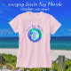 Bright colorful Siesta Key Florida sea shell t-shirt. The shell shape is a moon shell variety, which is beautifully spherical. The shell is depicted in various shades of pinks and purples. The circular background is bright turquoise, bright magenta purple, and green. Siesta Key, Florida is above the framed shell, in light magenta. This nature inspired shirt is the special vacation souvenir you've been looking for.