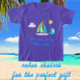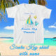 Chave Siesta colorida divertida, ondas oceânicas da Flórida, sol e camiseta de souvenir para crianças de veleiro. O barco é azul-turquesa brilhante, branco e amarelo. Há uma nuvem inchada, sol amarelo brilhante e ondas azuis e brancas. Siesta Key, Flórida está em um roteiro abaixo das ondas, em azul brilhante com um contorno azul escuro. Há um modelo acima do trabalho de arte para o nome da criança.
