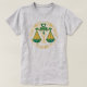 Sinal de Libra do zodíaco em verde e amarelo numa t-shirt.